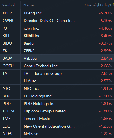 Hot Chinese ADRs and ETFs fell in overnight trading on Friday. XPeng fell 6%; CWEB fell 5%; iQiyi fell 4.5%; Baidu, Bilibili fell 3.4%; Li Auto, Alibaba fell 3%; PDD fell 2%.