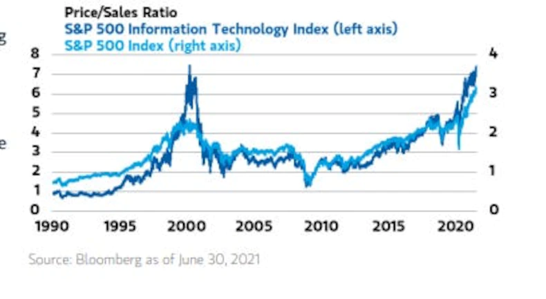 In a Monday note, Lisa Shalett highlighted how low rates have helped prop up tech stocks to dot-com era valuations. The price to sales ratio of the technology sector is at a level not seen since the peak of the dot-com bubble in 2000, she said.