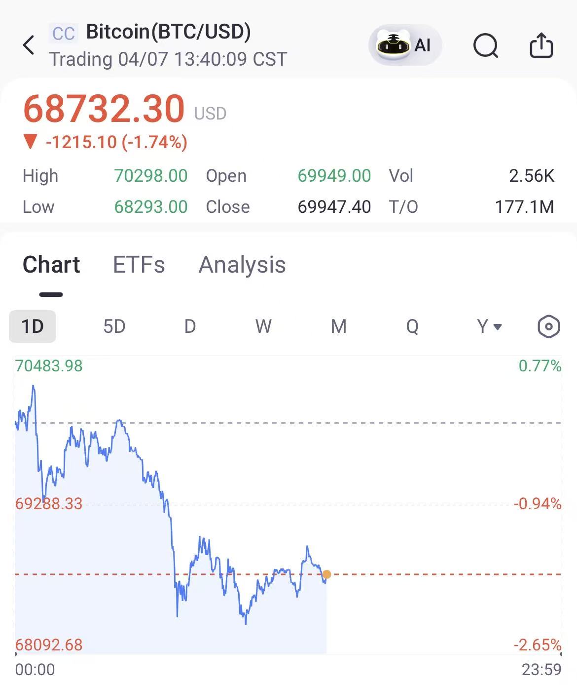 Bitcoin slipped 1.74% to $68,732.3 Tuesday, as cryptocurrencies were caught up in the broader market volatility ahead of President Donald Trump’s deadline for Iran.