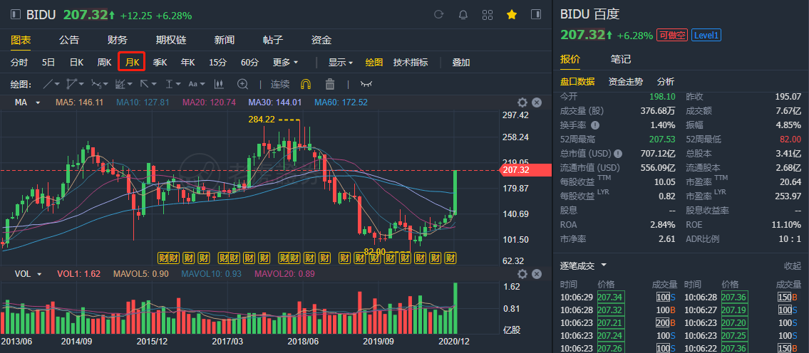 与投研机构的判断一致,近期,百度股价一路攀升,一度突破200美元,市值也稳定在650亿美元以上。