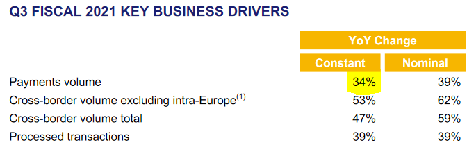 In the third quarter, Visa posted revenue growing by 26.7% Y/Y to $6.13 billion. Payment volume growth of 34% easily surpassed the 26.2% consensus estimate.