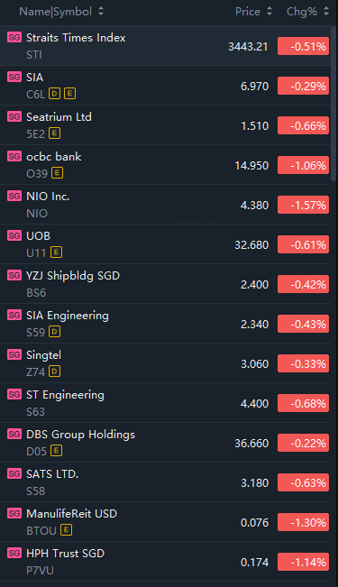 Singapore stocks opened lower on Monday. STI fell 0.5%, SIA fell 0.3%; Seatrium fell 0.7%; NIO fell 1.6%; UOB fell 0.6%.