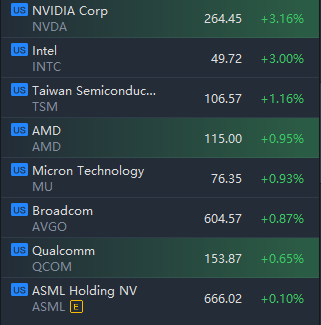 Semiconductor stocks rose in morning trading, with Nvidia and Intel jumping above 3%.