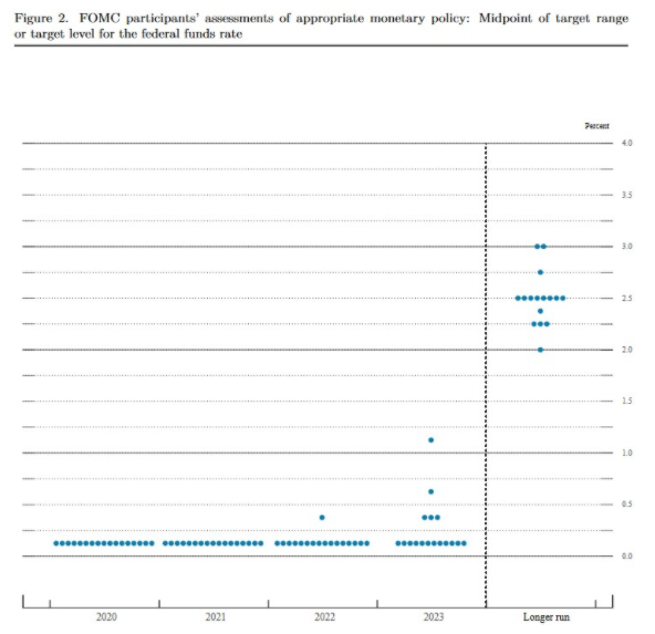相比之下,渣打银行认为,点阵图显示2023年有一次加息其实更接近中性。因为货币市场已经计入了大量的加息预期,因此点阵图暗示加息25个基点不会是太大的意外。不过这位策略师也补充称,市场最初会将这解读为轻微的鹰派。
