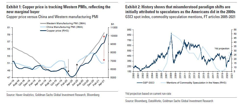 Goldman then slams the latest episode of blaming speculators, pointing to a long and distinguished history "of attributing paradigm shifts in prices to speculation" and noting that "China’s current crackdown on commodity speculation mirrors similar moves by the US in the mid-2000’s.When commentators are unable to understand what is driving such a paradigm shift in prices, they attribute it to speculators - a common pattern throughout history which has never solved fundamental tightness."