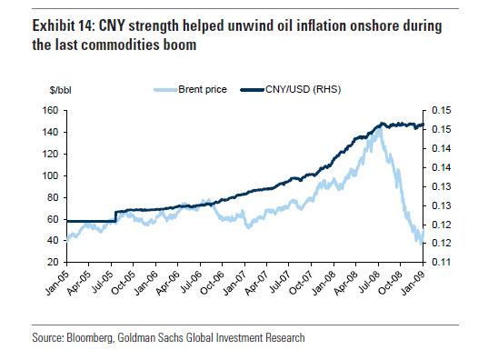 While Goldman economists see yuan appreciation on the horizon (12m forecast is 6.2), upside is capped by the need for China to retain export competitiveness - a key driver of the Chinese mercantlist economy. Moreover, as the CNY accounts for c.15% of the US Dollars Trade Weighted basket, any appreciation reignites the dollar-commodities reflation cycle.