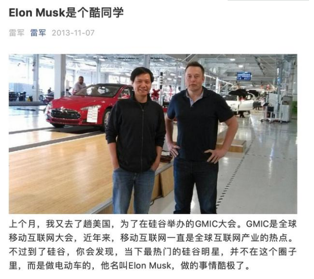 而雷军本人,对新能源汽车更是抱着极为开放的心态。早在2013年,雷军到硅谷参加了一次GMIC大会,大会上,新能源汽车给他留下了极为深刻的印象。甚至,他在当年的11月还发布了一篇文章,专门谈到了“酷同学”——Elon Musk,还随文附上了两人的合影。