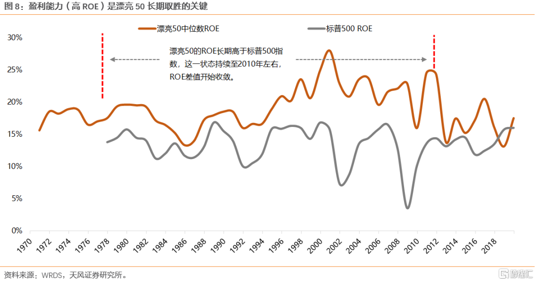 盈利能力(高ROE)是漂亮50长期取胜的关键。漂亮50的ROE长期高于标普500指数,这一状态持续至2010年左右,之后的ROE超额表现弱化,原因在于2010年之后的漂亮50,已非70年代的漂亮50。而漂亮50相对标普500的超额收益也在这个时间点之后开始走弱。