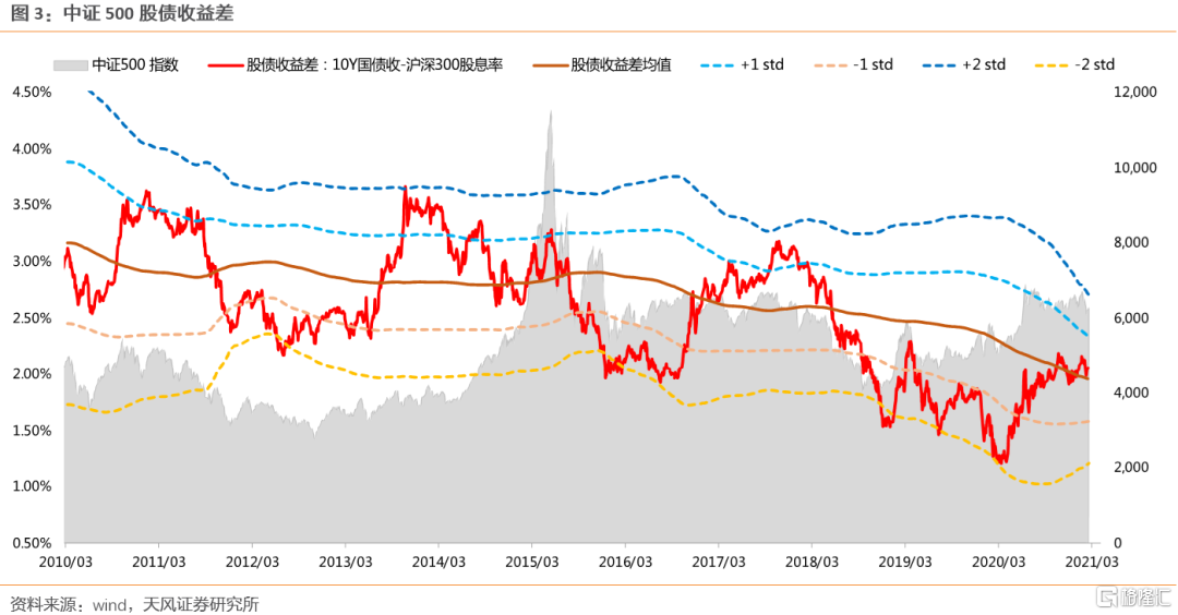 同样逻辑,上图中,我们用10Y国债收益率减中证500股息率来衡量中证500的性价比。