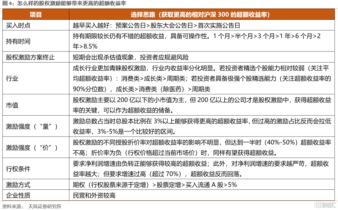 (6)激励强度(“量”):激励总数占当时总股本比例在3%以上能够获得更高的超额收益率,但过高的激励占比反而会拉低收益率,3%-5%是一个比较好的区间。