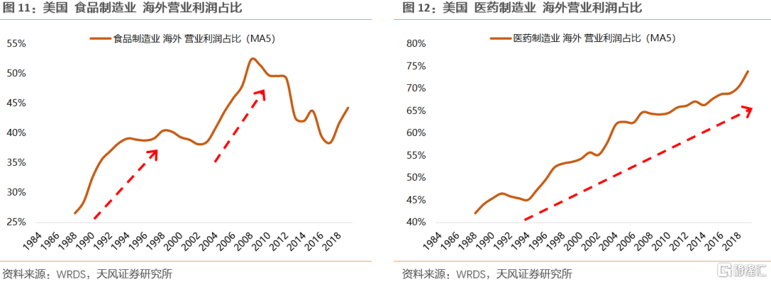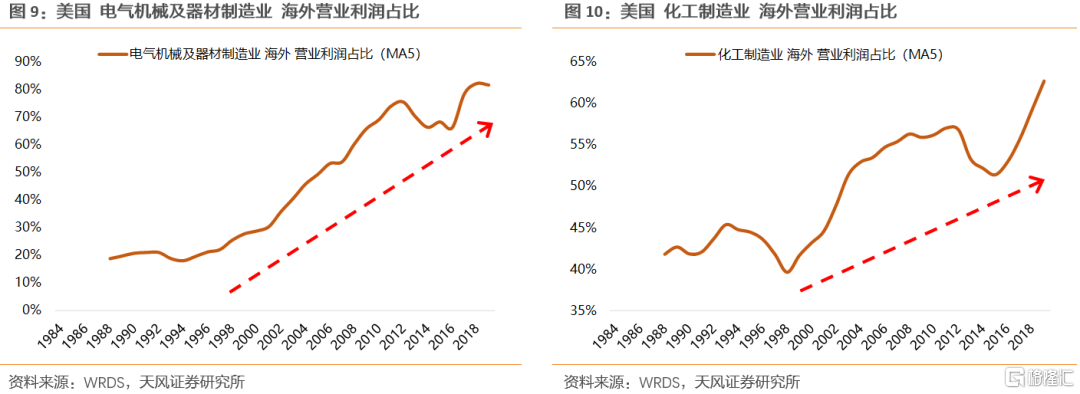 80-90年代以来,美股公司全球化扩张的步伐,是支撑美股各行业龙头盈利和股价再上台阶的关键。全球化扩张不只带来这些行业龙头公司新的成长空间,而且也驱使行业周期性弱化,甚至能获得盈利能力中枢的抬升。