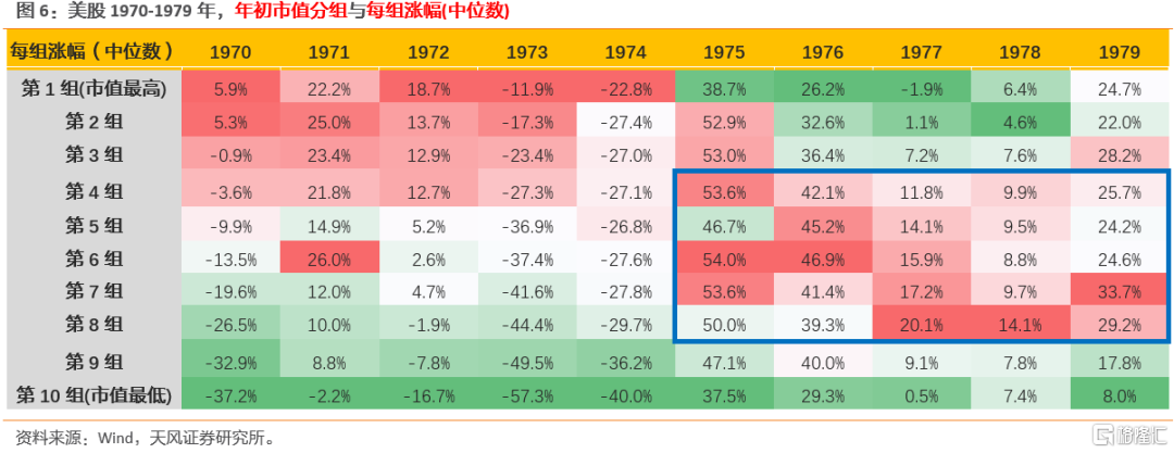 可以发现,在美股漂亮50消化估值的75-79年中,美股的中盘股(4-8组)出现了连续5年左右的跑赢。也是近50年来,美股中盘股持续跑赢时间最长的一次。