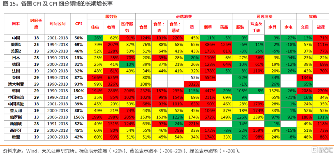 从各国的CPI及CPI细分领域的长期增长率,并非所有的消费行业CPI都能跑赢整体CPI,一般来说,必需消费品长期增速高于整体CPI,而可选消费品的长期增速低于整体CPI。这与美股市场上必需消费品长期跑赢可选消费品的逻辑是一致的,必需消费品容易有品牌和客户忠诚度积累,且若有行业集中趋势的行业,则增长率还能有加成。