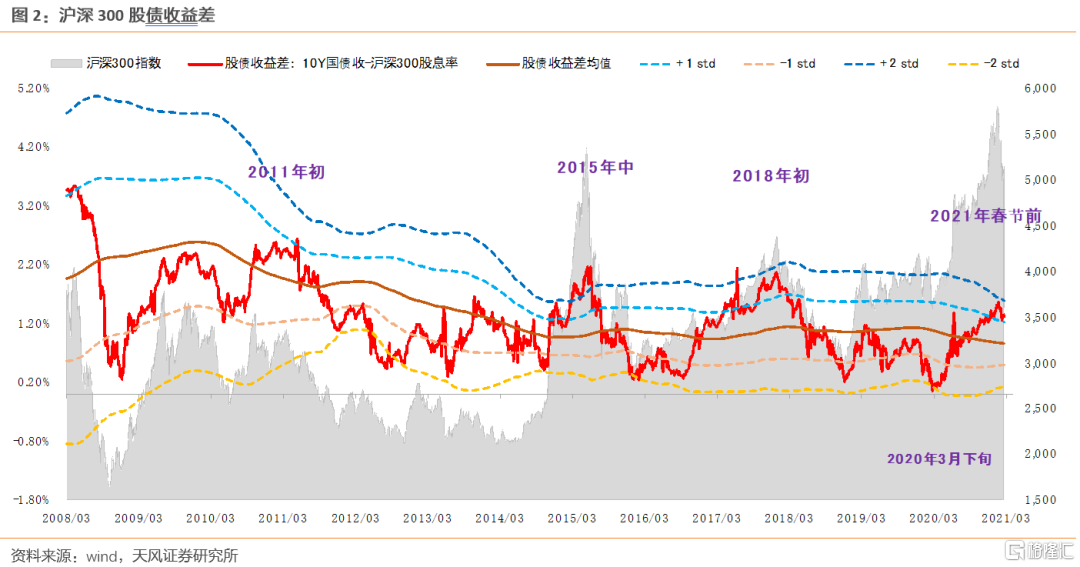 相反,当股债收益差接近正两倍标准差的时候,市场随后都会产生一定风险,比如典型的2021年春节前、2018年初、2015年中等。