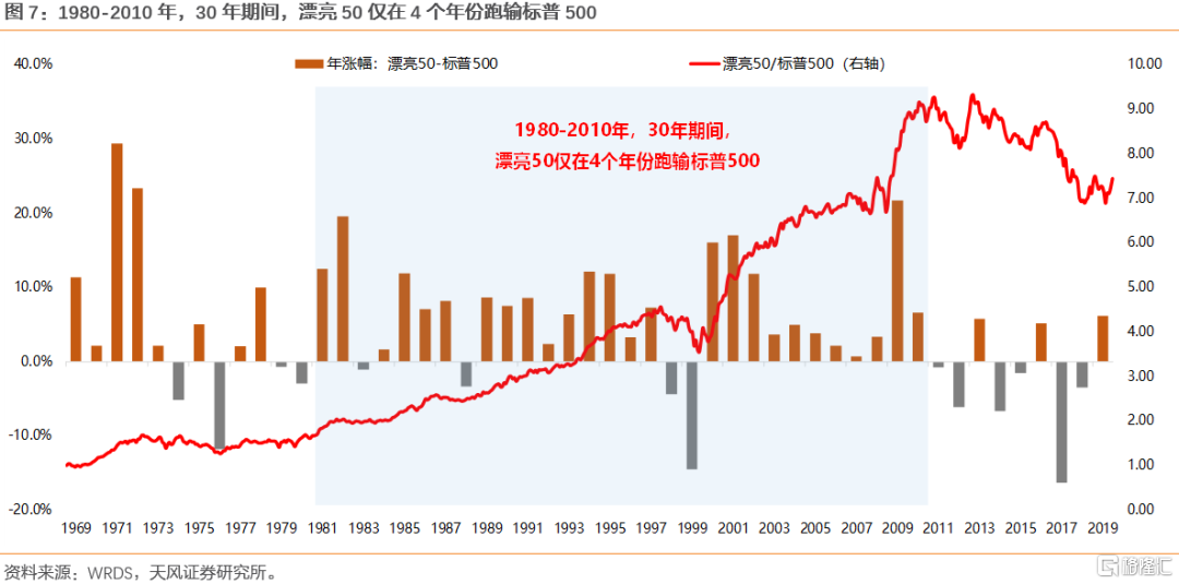 80年代,漂亮50上涨457%,标普500上涨226%,超额收益231%;