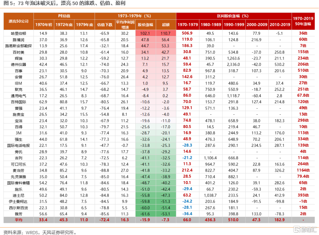 ① 73-79年,漂亮50杀估值阶段,抗跌的是盈利有正向催化的公司,或拔估值阶段泡沫较小的公司;而对于连续上涨之后估值透支严重的公司,杀估值风险较大。