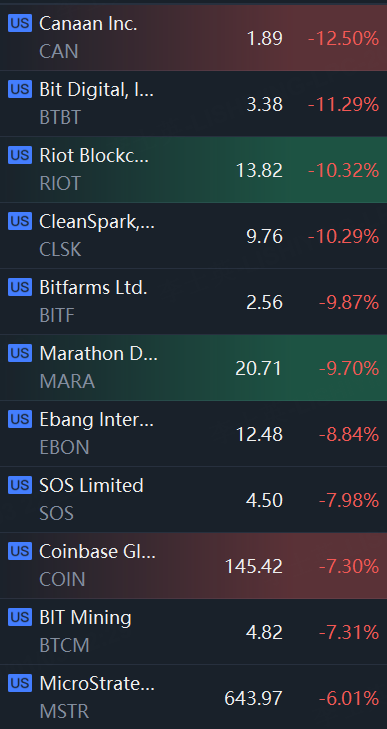 Crypto stocks tumbled in morning trading. Canaan fell 12.5%; Bit Digital fell 11.3%; Riot Blockchain, CleanSpark, Bitfarms and Marathon Digital fell about 10%; Coinbase fell 7%; MicroStrategy fell 6%.