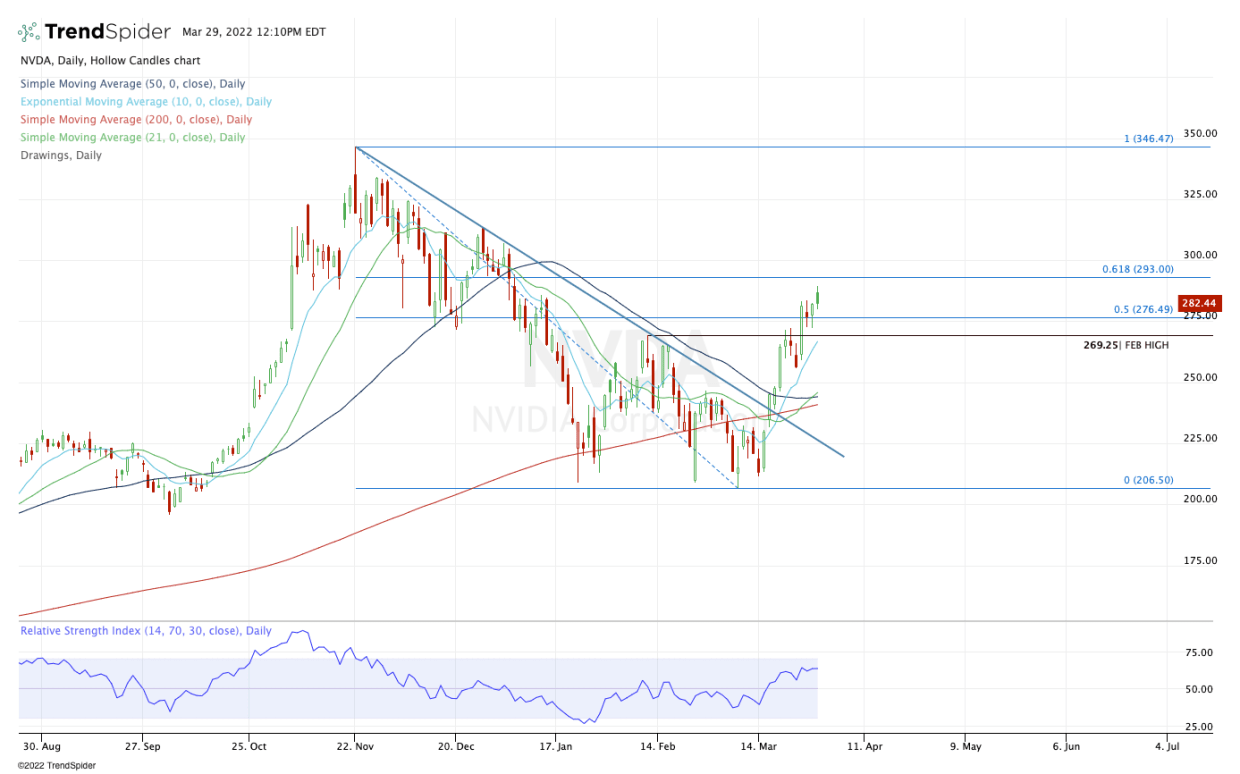 Nvidia stock has been on a tear lately. While it hasn’t put together a 10-day rally like Apple, Nvidia’s 40% rally off this month’s low is quite impressive.