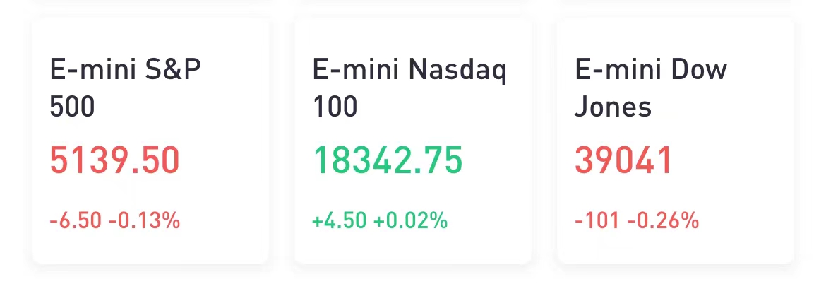 At 7:50 a.m. ET, Dow e-minis were down 101 points, or 0.26%, S&P 500 e-minis were down 6.5 points, or 0.13%, and Nasdaq 100 e-minis were up 4.5 points, or 0.02%.