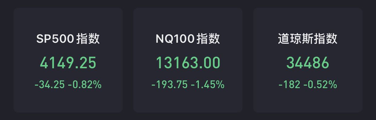 美国三大股指期货全线下挫,截至发稿,道指期货跌0.52%;纳斯达克100指数期货跌1.45%;标普500指数期货跌0.82%。