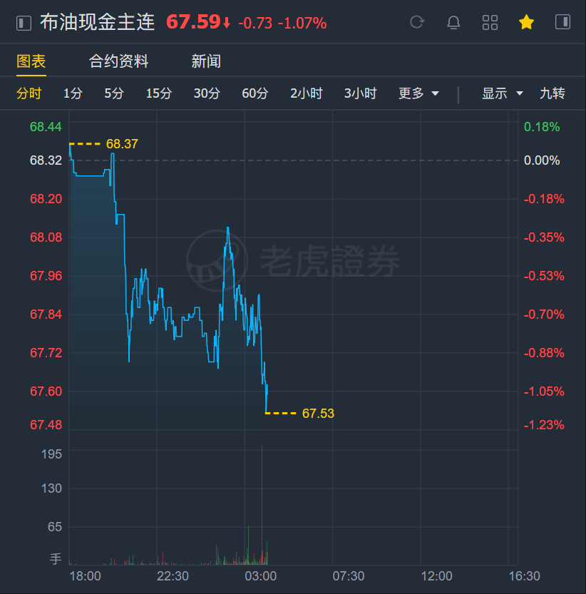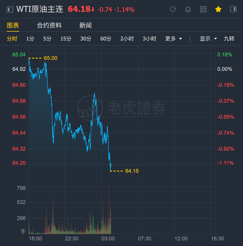 国际油价震荡下挫,截止发稿,WTI原油报64.18美元/桶,跌1.14%;布油现报67.59美元/桶,跌1.07%。