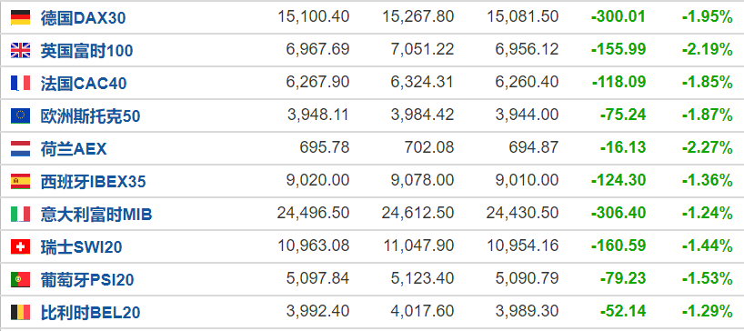 欧洲主要指数跌幅扩大,截止发稿,德国DAX指数跌1.95%,英国富时100指数跌2.19%,法国CAC40指数跌1.85%,欧洲斯托克50指数跌1.87%。