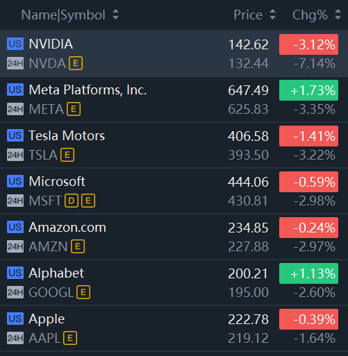 Big Tech stocks dropped in overnight trading. Nvidia fell 7%; Tesla, Meta, Alphabet, Amazon and Microsoft fell around 3%; Apple fell 1.6%.