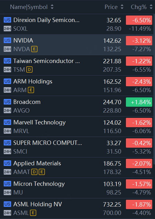 Except for Nvidia, other chip stocks also fell in overnight trading. SOXL fell 11.5%; TSMC, Arm, Broadcom, Marvell fell 6%.