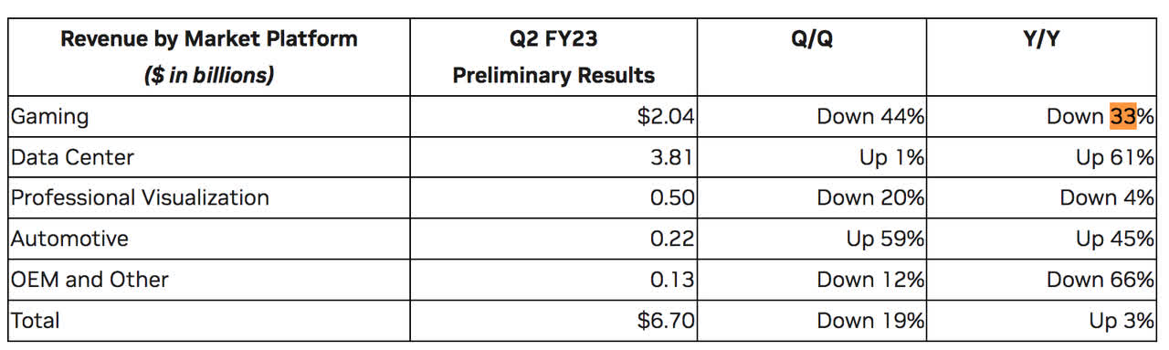 We called out NVDA's exposure to crypto-mining GPU demand back in April. NVDA's recent preliminary results confirm our predictions that GPU sales will drop. NVDA founder and CEO Jensen Huang stated that NVDA's GPU sales have "declined significantly." Preliminary results predict NVDA's gaming revenue to fall 33% year-to-year and a hefty 44% quarter-on-quarter. The following graph outlines NVDA's negative pre-announcement for 2Q23.