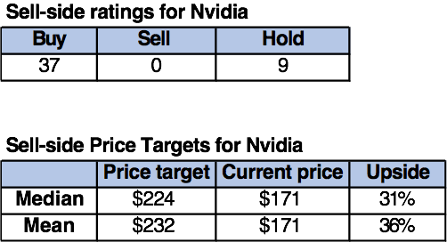 Wall Street is a strong buy on NVDA. Of the 46 analysts, 37 are buy-rated, and nine are hold-rated. The sell-side ratings are also overly optimistic about the stock. NVDA is currently trading at $171. The median sell-side price target is $224, while the mean is $232, with a potential upside of 31-36%. We think there is more downside on the stock than the market is pricing it in. The following chart illustrates the sell-side ratings, price targets, and upside potential.