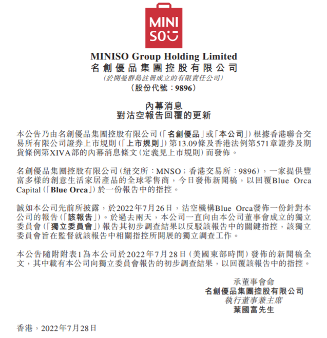 7月28日,名创优品公布针对Blue Orca沽空报告的初步调查结果:1)该报告中关于本公司特许经营业务模式的指控毫无依据。2)该报告指控叶主席通过一系列房地产交易挪用首次公开发售所得款项亦毫无依据。3)该报告关于本公司业务前景的描述毫无依据。