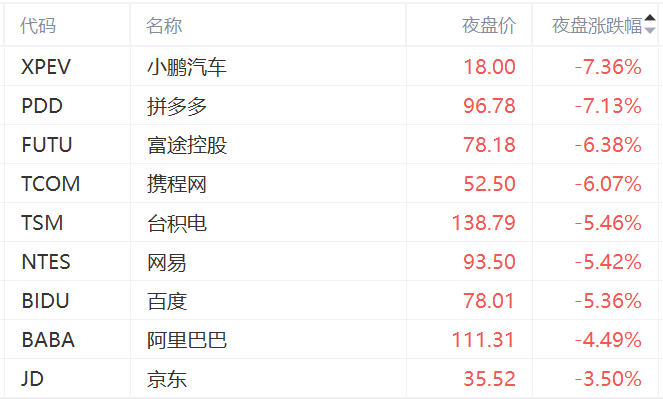 热门中概股普跌, 小鹏汽车 、 拼多多 跌超7%, 台积电 、 网易 、 百度 跌超5%, 阿里巴巴 跌超4%: