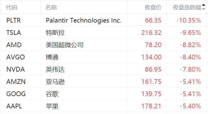 本周一(4月7日)美股夜盘时段,明星科技股全线暴跌, Palantir Technologies Inc. 跌超10%、 特斯拉 跌超9%、 美国超微公司 、 博通 跌超8%, 英伟达 跌近8%:
