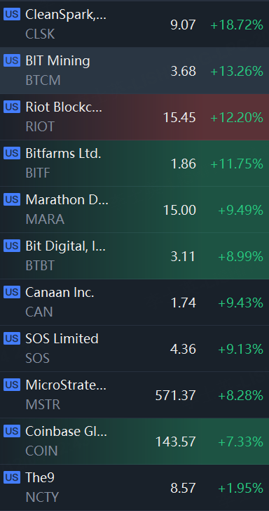 Crypto stocks jumped in morning trading Monday. Cleanspark rose 19%; Bit Digital rose 13%; Riot Blockchain rose 12%; Bitfarms rose 11%; Marathon Digital rose 9%; MicroStrategy rose 8%; Coinbase rose 7%.