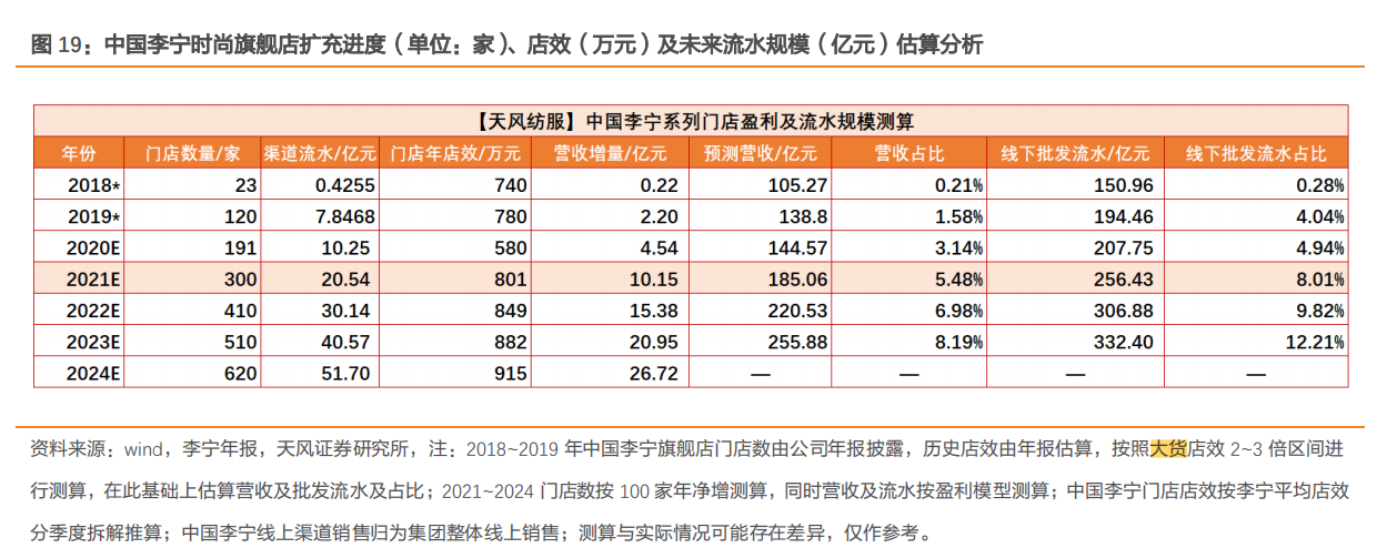 中国李宁渠道铺设目前尚处于高速拓展阶段,截至2019年底该系列时尚旗舰店数量为120家。天风证券估算,中国李宁系列2020年门店数量净增71家门店,2021~2022年预计门店净增数量分别达到109、110家,将在2025年接近门店数量的上限500-650家,届时该系列流水规模有望突破50亿元。