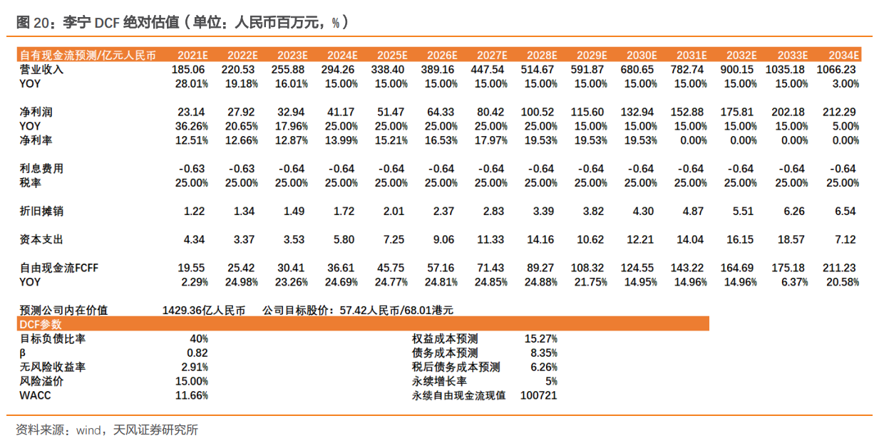 2023-2028为李宁公司的快速增长期,归母净利润CAGR保持在20%,2029-2033年为稳定增长期,公司整体归母净利润CAGR保持在15%,2034年以后为永续期,归母净利润及FCFF增速恒定为3%。