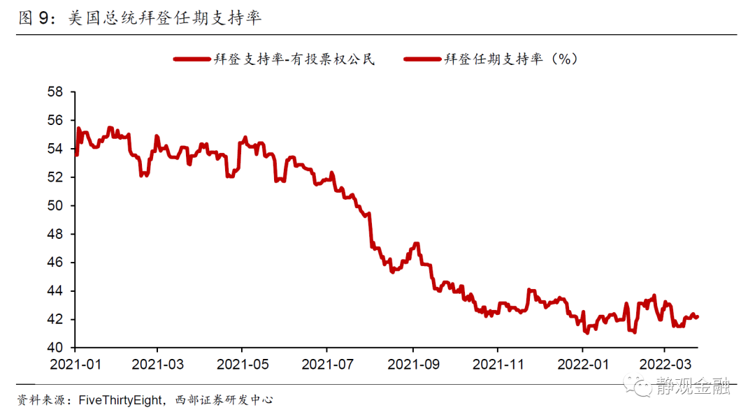 2021年Q3中后期美国财政发债压力有所缓解,与此同时,随着通胀走高,总统拜登支持率骤降。这令美联储货币政策锚开始由帮助财政部压低债务支出成本转向打压通胀。结合前文可知,高通胀对总统执政力存在致命打击,因此在财政约束解除后扭转通胀局势就成为美联储货币政策的当务之急。在此背景下,美联储自去年Q4开始Taper,今年3月首次加息,并给出了5月加息50BP且启动缩表的前瞻指引。鉴于通胀尚未降温,进而拜登支持率仍处于任期低位,这也使得美联储不断释放更快紧缩的信号。