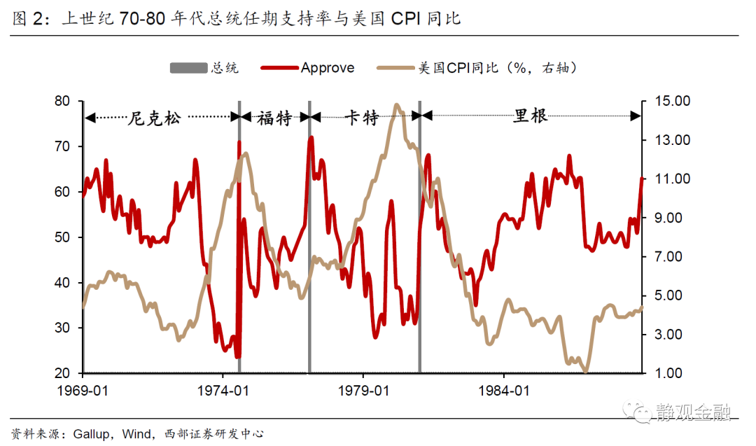 如图2所示,70-80年代四任美国总统的任期支持率与通胀的负相关特征极其明显,不仅高开低走是常态,只要任期通胀高企其支持率也势必断崖式下滑。甚至于水门事件对尼克松支持率的打击看似都不及通胀。高通胀形势下,福特总统未能连任,1979年卡特总统支持率也降至30%下方。为了扭转任期支持率颓势,1979年7月15日卡特总统曾发表著名演讲《信任危机》,随后将内阁13名成员全部换掉并任命保罗·沃尔克出任美联储主席。换言之,沃尔克临危受命接管联储就是为了打压高通胀提振政府公信力。