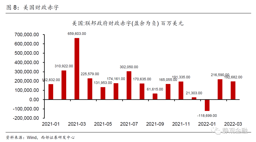 1)2021年9月前美联储的政策锚是财政。去年9月前美联储始终表示高通胀是暂时的、不会持续,是因为彼时的政策锚是财政。2021年3月11日拜登政府实施了第三轮疫后财政转移支付政策。随后数月美国均保持较高的财政赤字水平,进而美联储无法Taper、加息。在财政约束下,美联储无法承认高通胀的持续性。