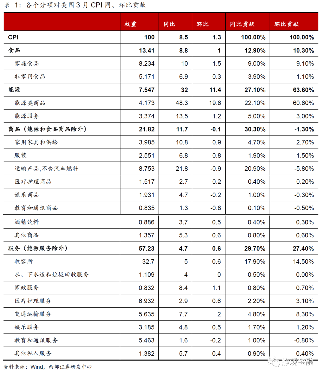 美国通胀或已于3月(接近)见顶。去年Q4以来美国高通胀主要由三个分项驱动:能源、二手车及居住。3月美国CPI同比8.5%再创新高,但主因仍是上述三点。只不过3月CPI中涨价因素集中于能源分项,只要俄乌局势稳定,该因素将在4月逆转。二手车所在分项(运输产品,不含汽车燃料)对3月CPI环比贡献已然转负,表明疫情引发的结构性通胀矛盾已经显著缓解。随着基数抬升,二手车所在分项对Q2的CPI同比贡献也将大幅转弱。居住型通胀因素对3月的同、环比贡献并未较2月上升,表明该分项相对稳定,由于去年5-7月美国房价增速见顶,进而今年Q2末CPI居住分项亦有望高位回落。总体而言,美国CPI同比或已于3月(接近)见顶。
