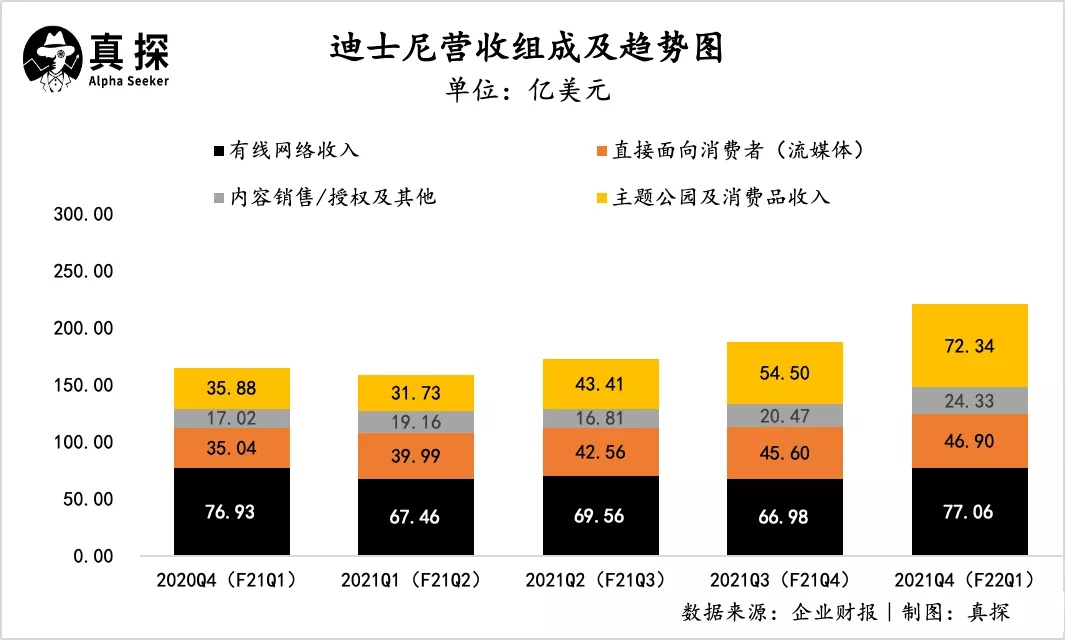 迪士尼总营收划共分为四部分,分别是有线网络、直接面向消费者(Disney+、Hulu、ESPN+)、内容销售、授权业务以及主题公园收入。