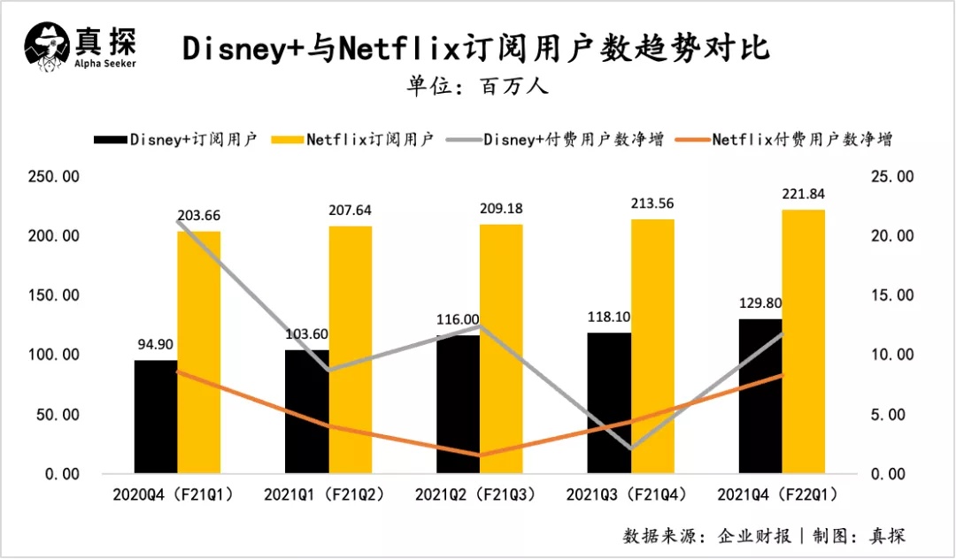 近1200万用户数的新增,也让Disney+与老对手Netflix在用户流量的比较中再次夺回了优势权。上个月,Netflix新增828万用户,低于预期的850万,2022年Q1预计新增250万,也远低于分析师预期的590万,这份略显惨淡的财报使得盘后股价跌近20%,也带动了迪士尼股价的下滑。