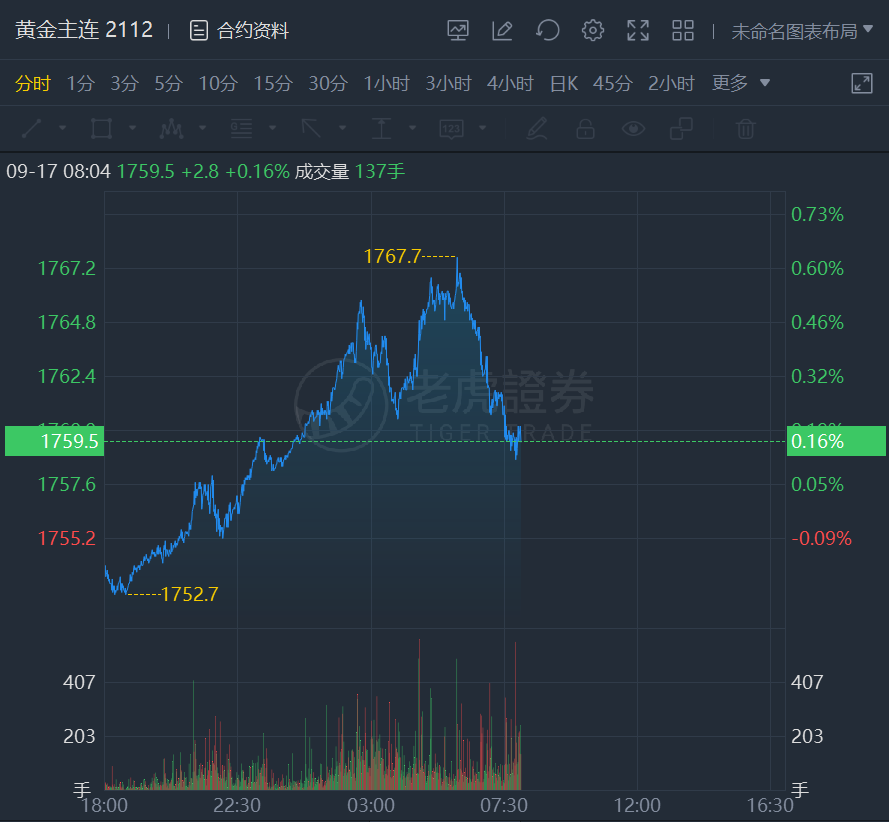 黄金期货日内涨幅缩窄,截止发稿,涨0.16%,报1759.5美元/盎司。