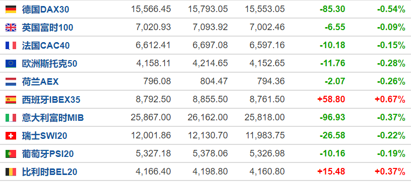 欧洲主要股指多数下跌,截至发稿,德国DAX30指数跌0.54%,英国富时100跌0.09%、法国CAC40跌0.15%。