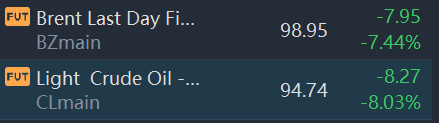 WTI crude fell 8% to $94.74 a barrel, Brent fell 7.44% to $98.95 a barrel.