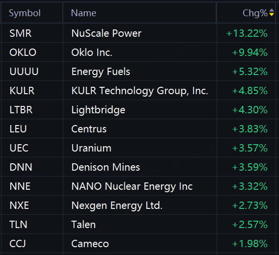 Nuclear energy stocks rose again in morning trading. NuScale Power rose 13%; Oklo rose 10%; Energy Fuels and KULR Technology rose 5%; Lightbridge, Centrus, Denison Mines, and Uranium rose 4%; NANO Nuclear Energy and Talen rose 3%.