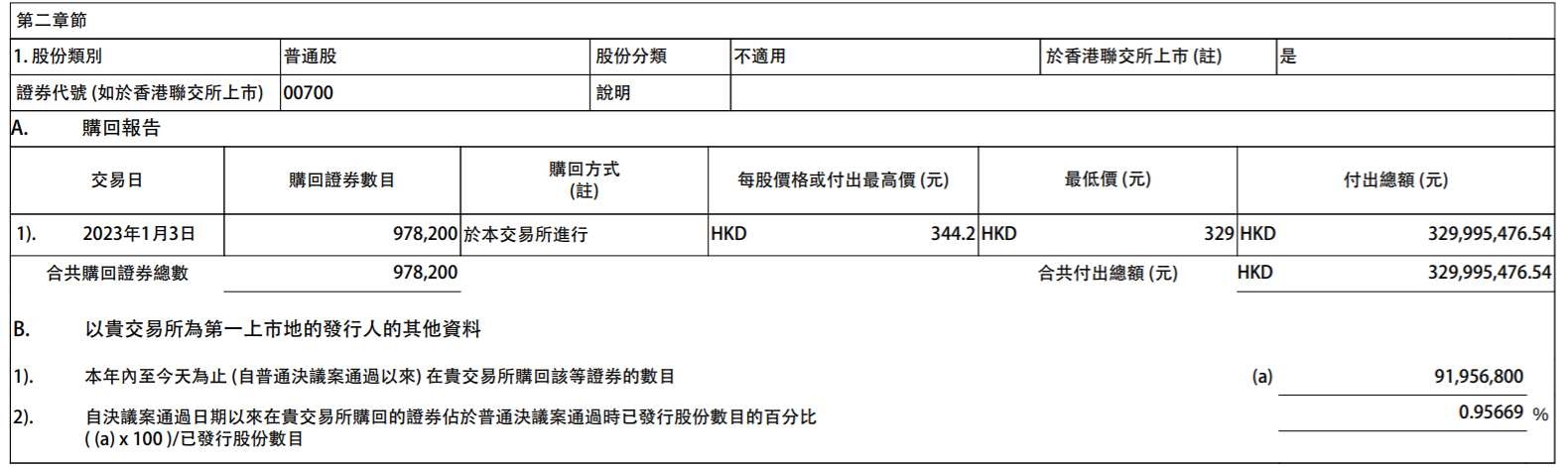 腾讯控股:于2023年1月3日回购97.82万股,回购价格为329-344.2港元,共耗资约3.3亿港元。
