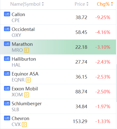 Exxon Mobil, Chevron, Occidental, Marathon, Callon, and Halliburton fell between 1% and 9%.