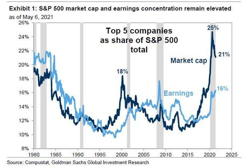 Despite its ringing endorsement of FAAMGs, Kostin admits that one common concern with this thesis relates to the high current market concentration compared with history, to wit:he five largest stocks in the S&P 500 represent 21% of index capitalization, significantly more than the long-term average of 14%, above the 18% at the peak of the Tech bubble in 2000, and only trailing the 25% level reached during mid-2020.This large index weight of the top stocks is important because it serves as a practical headwind to continued appreciation given SEC restrictions on portfolio concentration that limit how much mutual funds can continue to buy them.