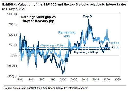 That said, if multiples were to shrink everything would crash, which is why Kostin writes that "the current low level of interest rates and the fast pace of expected growth support the lofty multiples of the FAAMG stocks." While the nominal 10-year Treasury yield has risen this year, at 1.6% it remains extremely low in historical terms, Kostin also makes some other valuation observations: